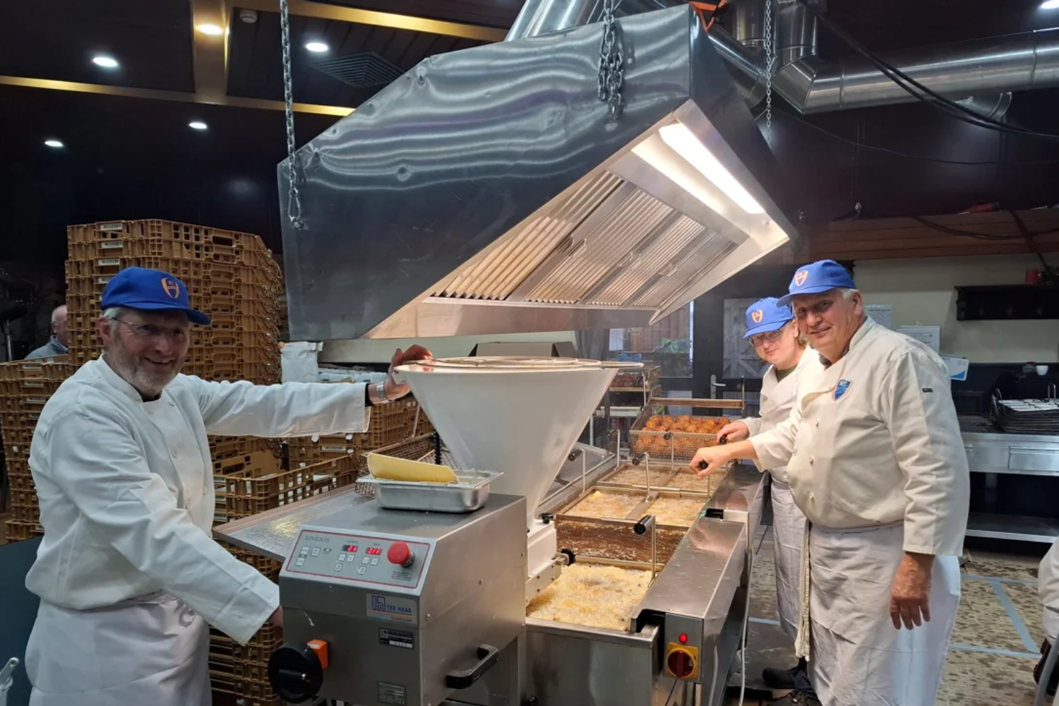 Gosse Terpstra, Ronnie Overgoor en Gerard Berendsen in De Tapperij bij de bakhoven waar duizenden oliebollen werden gebakken.